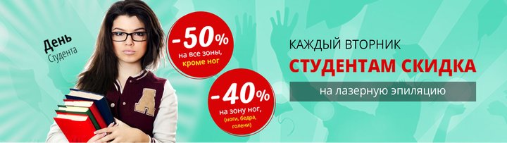 Каждый вторник для студентов в салонах лазерной косметологии «BoMond» действует скидка на лазерную эпиляцию -50% на все зоны (кроме ног) и -40% на все зоны ног (бедра, голени, ноги).